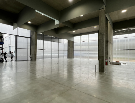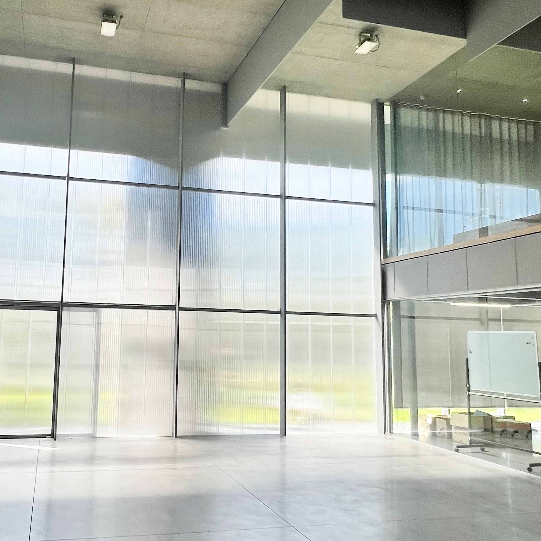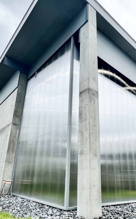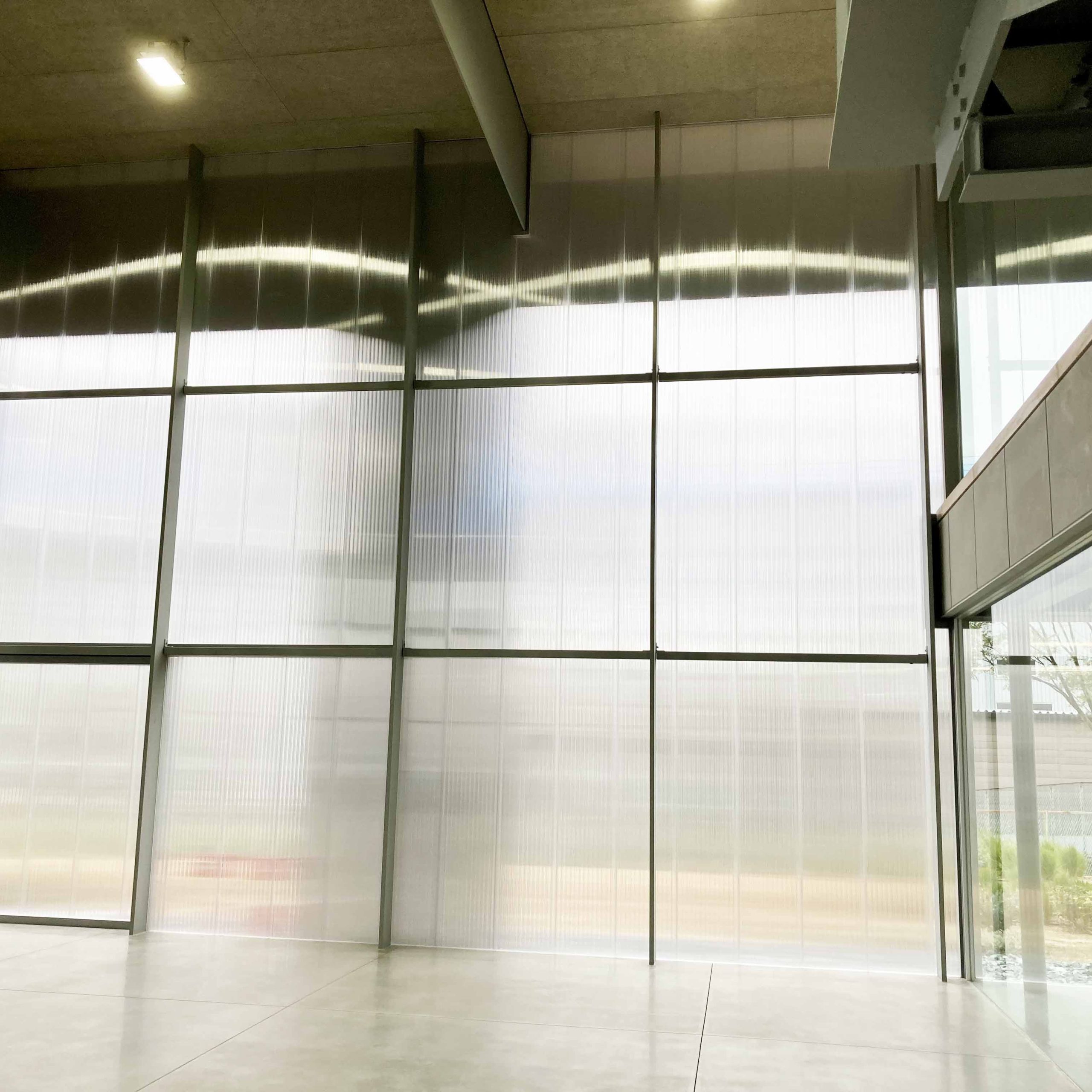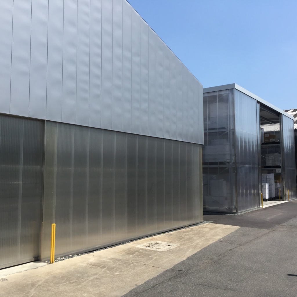 外装に採用されたポリカーボネートパネルにより、日中は照明を使用せずとも十分な明るさが確保されており、倉庫内部には安定した自然光環境が形成されています。