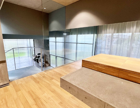 玄関ホールとの間はビニールカーテンで簡易的に区画されており、2階オフィスからの空調の影響も一部受けつつ、緩やかな環境制御が行われています。