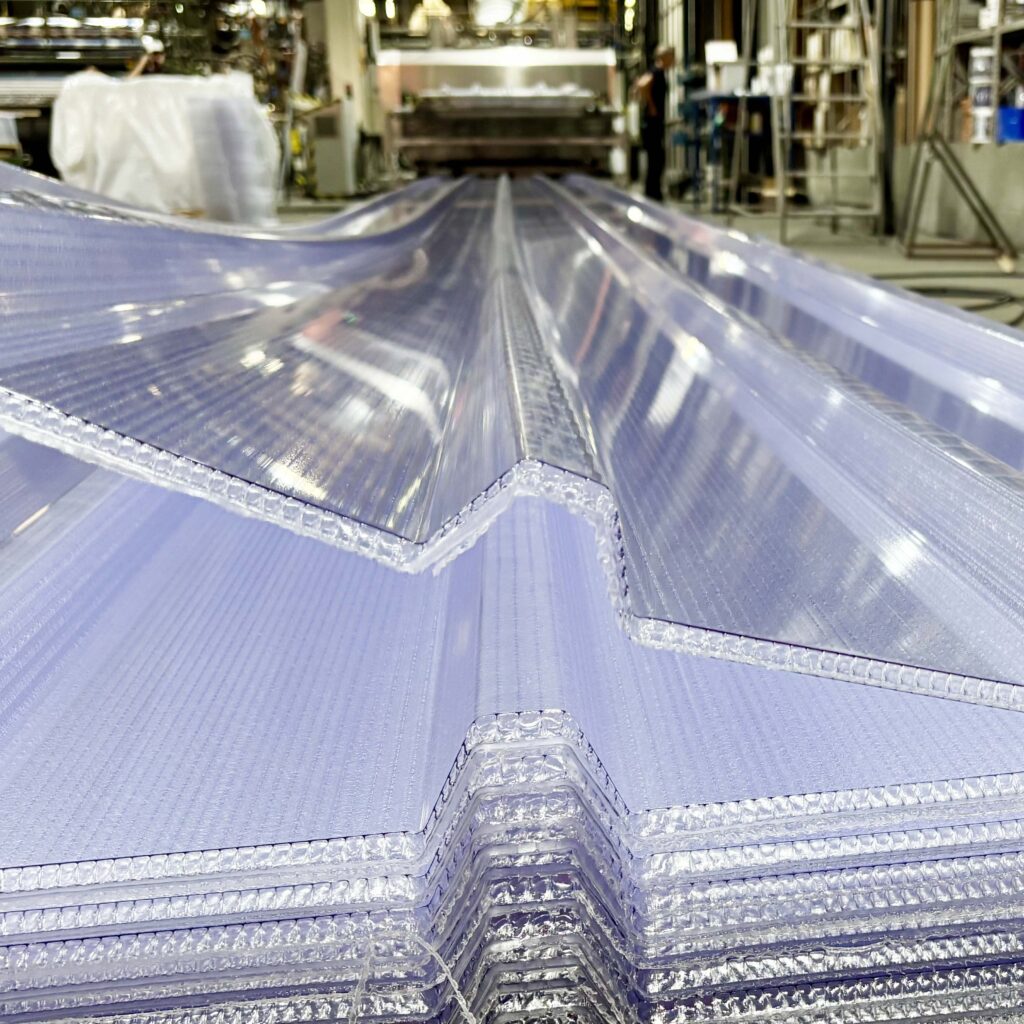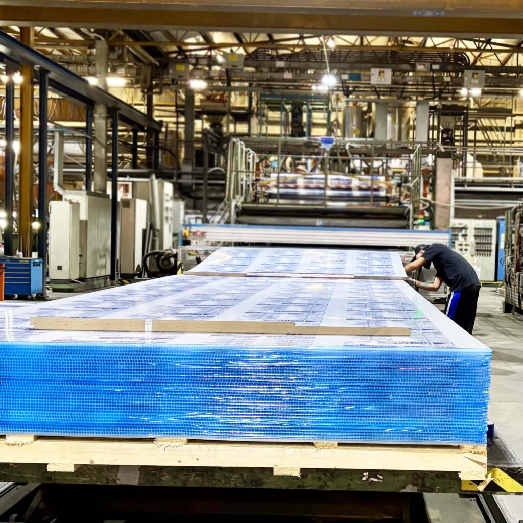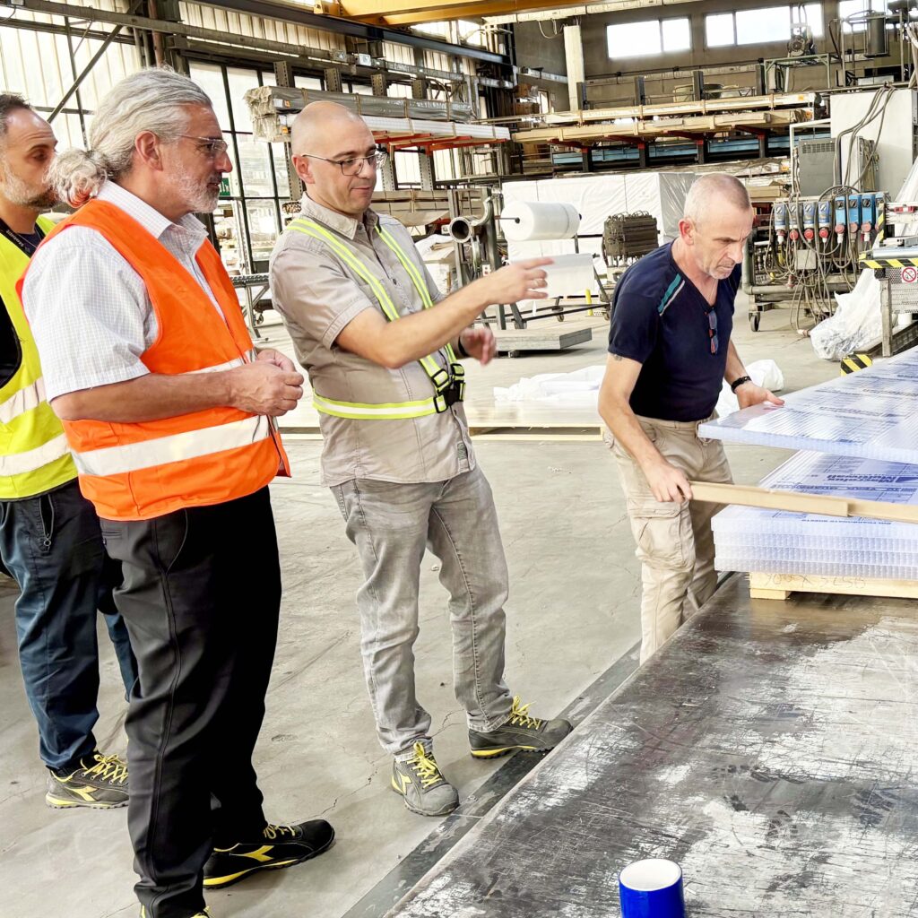 工場内では、出荷前の中空ポリカパネルを前にスタッフの方から丁寧な品質管理の説明を受け、誠実なものづくりの姿勢を間近に体感。