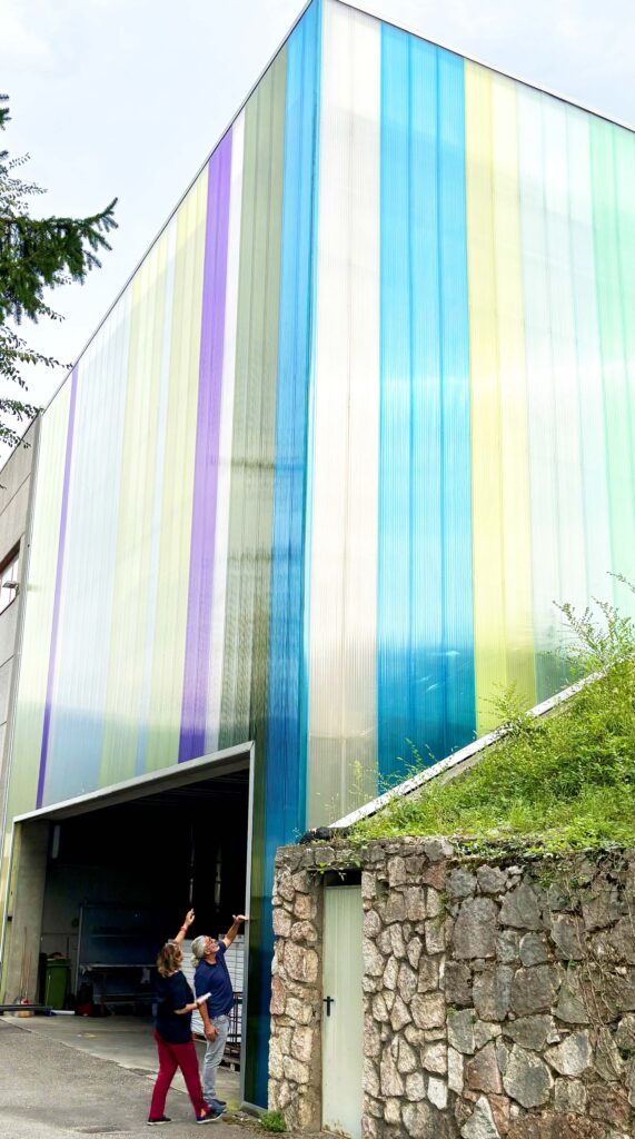 工場の外壁にも高さ約12メートルに及ぶ彩り豊かなSeplux製の中空ポリカが用いられ、建物全体が明るく華やかな印象を放っていました。