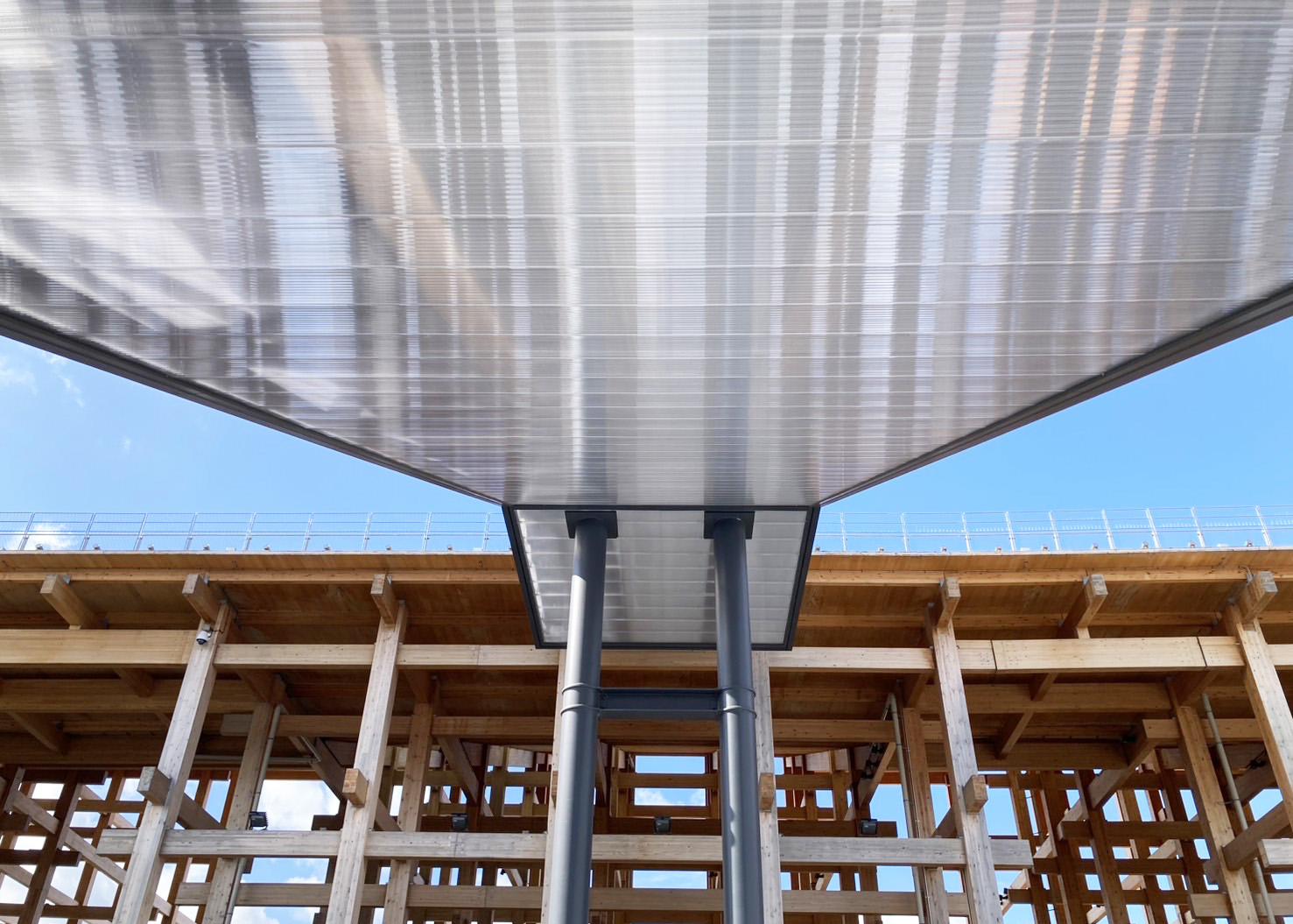 大屋根リングへとつながるエスカレーターの外装として採用された「SEPLUX」についてお声掛けをいただき、今回の展示に参加させていただく運びとなりました。